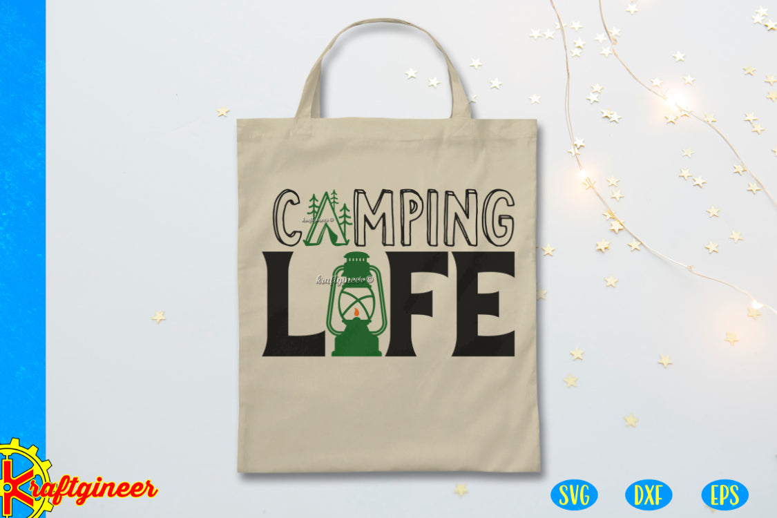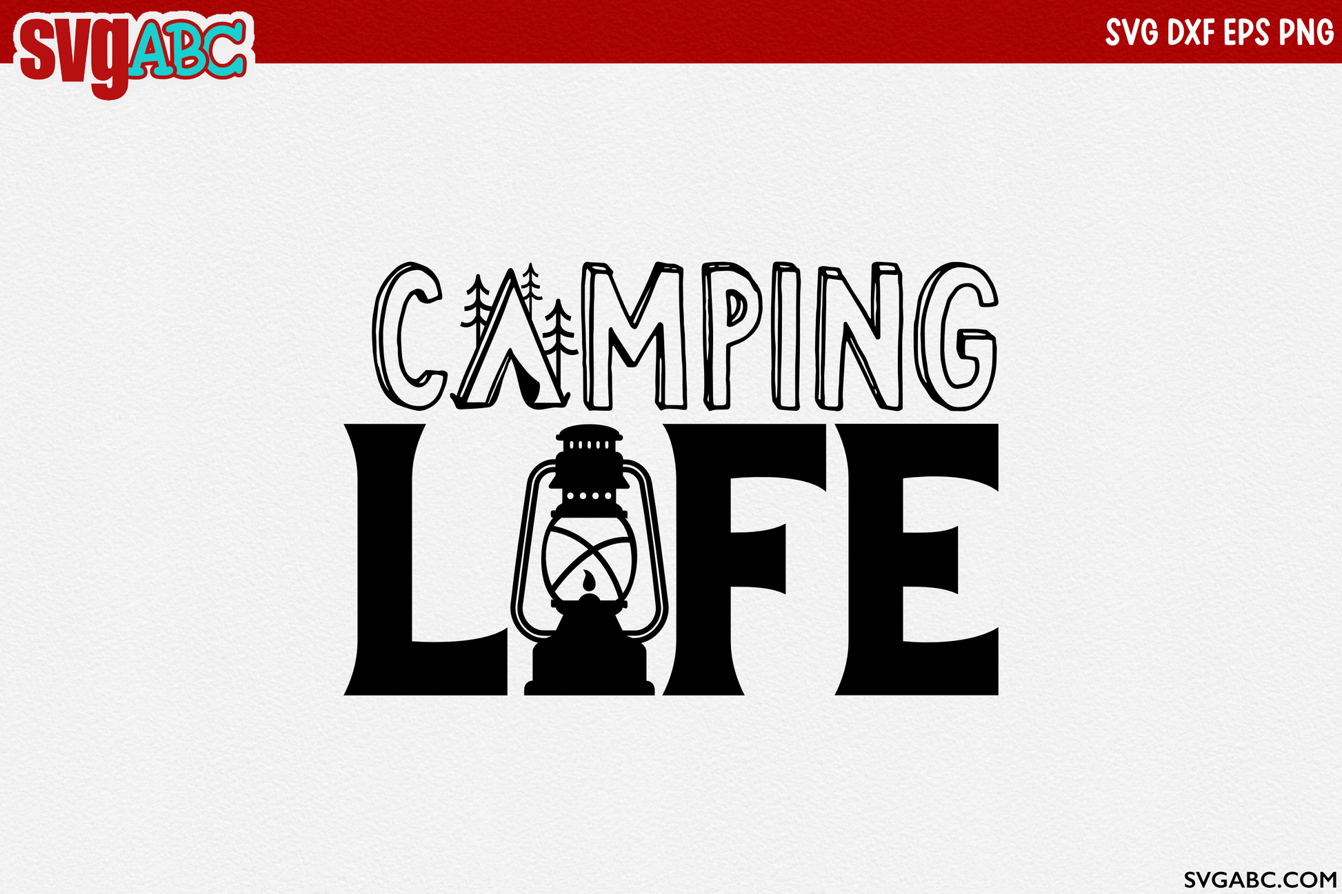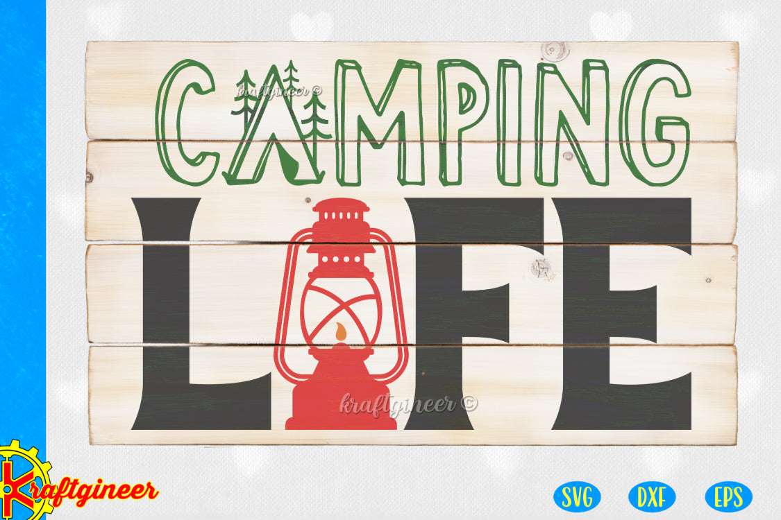 Easy to cut Camping Life design file. A vintage lantern forms the I in "Life" and a camping tent forms the A in "Camping." Mix and match colors on the design.