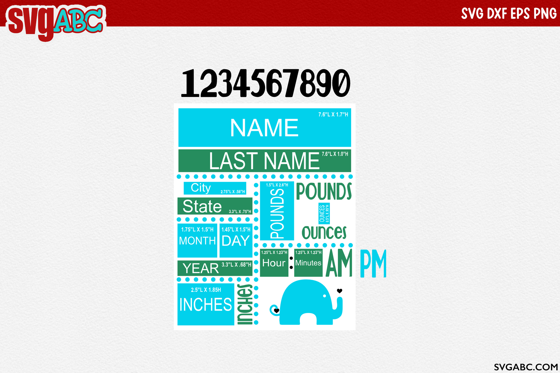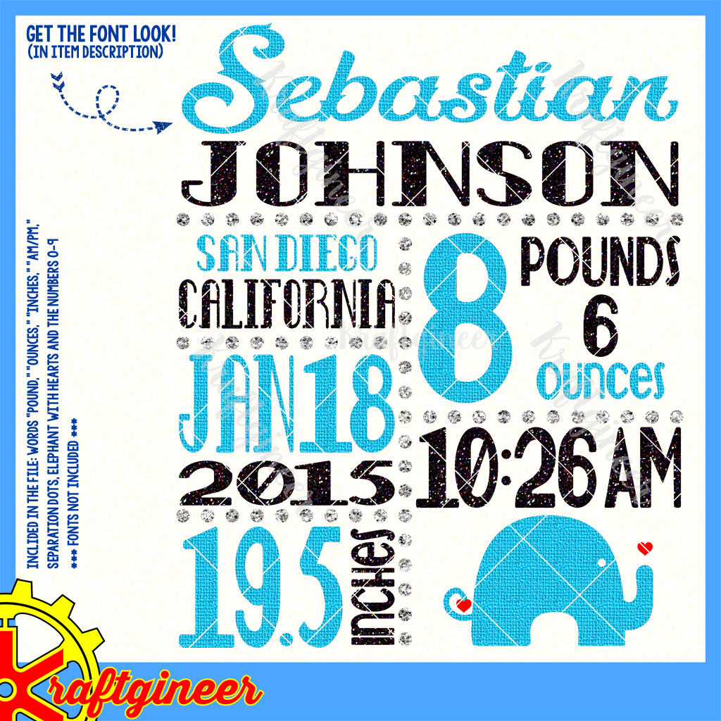 Make your own birth stats frame for the cute baby or babies in your life! This template includes the framing dots, the words “”POUNDS,” “INCHES,” “OUNCES,” “AM/PM,” the elephant with hearts, and the numbers from 0 through 9. Rectangles and squares with measurements provided to easily customize this design with your information. Each square has a measurement, unlock the proportions of your text and enter the measurements of the square you are substituting. For example type out the first name I the font of your choice, then set the text height to 1.7” and the text length to 7.6. After making the text the appropriate size center it on the square/rectangle you are replacing. REMEMBER to delete the rectangles once you are done substituting all the information. This design can be used on pillows, shirts, glass blocks, tiles, glass cutting boards, mason jars, floating frames, scrapbooking or any other craft medium. For use on many vinyl projects and even paper projects!