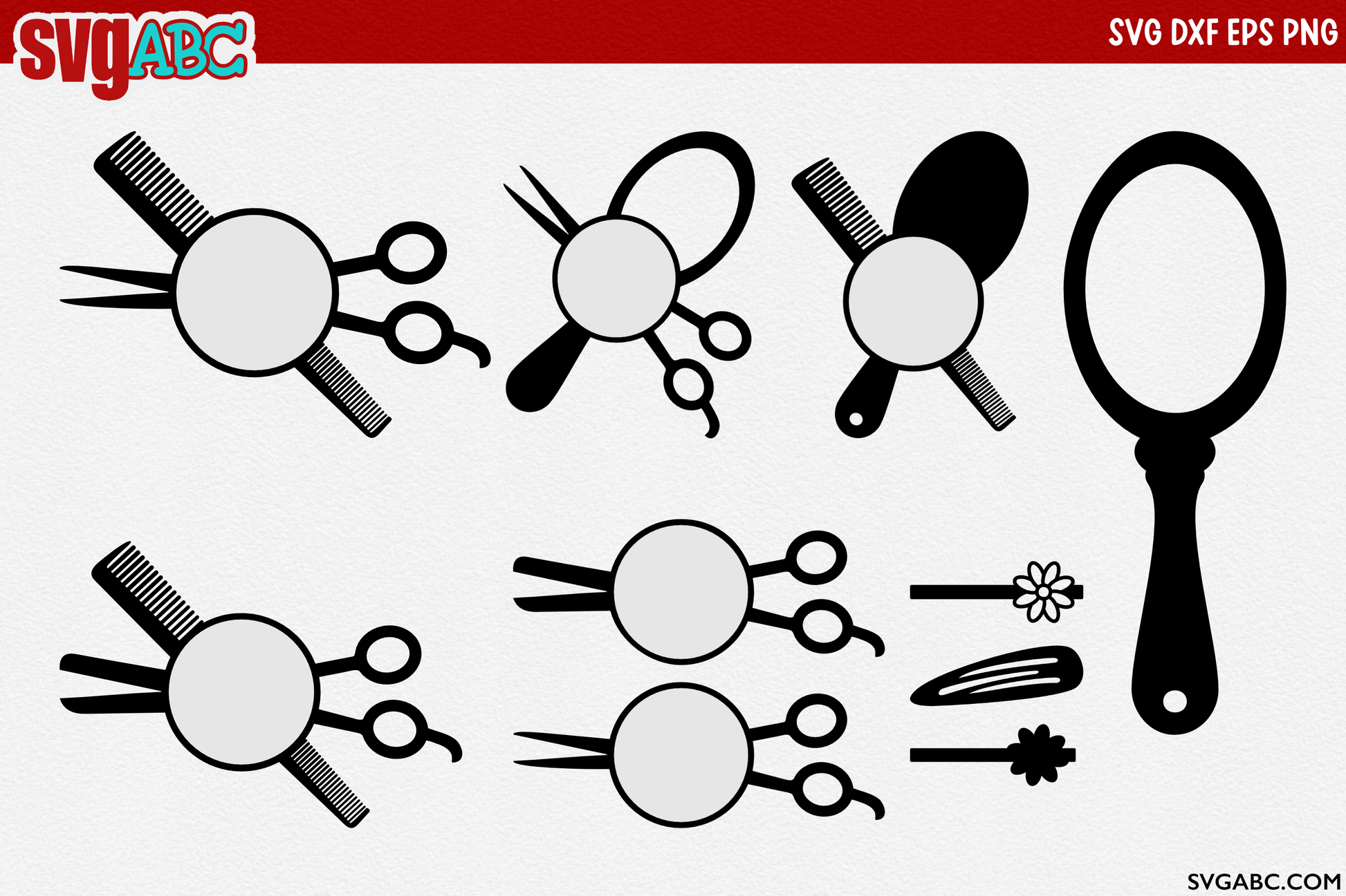 This complete hairdresser Hair Designs Set contains designs for monograms and other decoration items. The Hair Design Set contains a scissors monogram frame (sharp and other), a scissors and comb monogram frame (sharp and other), mirror and comb monogram frame, mirror and scissors monogram frame, a mirror, a snap clip, and two clips with flowers.