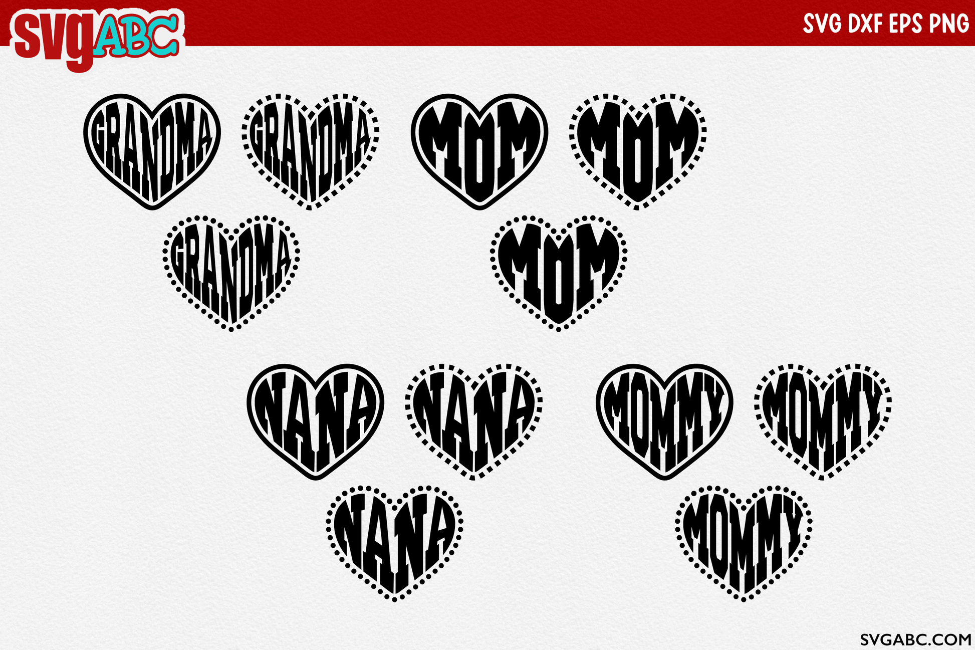 Show your mom, Nana, Grandmother or Mommy love with this design. Make it for yourself or as a gift for a special mom/grandma in your life. You get 12 versions of the design! You get four names in the shape of a heart, “MOM,” “NANA,” “MOMMY,” and “GRANDMA.” You also get three different frames paired up with each heart word. It can be used on shirts, glass blocks, tiles, glass cutting boards, mason jars, floating frame, shadow box or any other craft medium. For use on many vinyl projects.