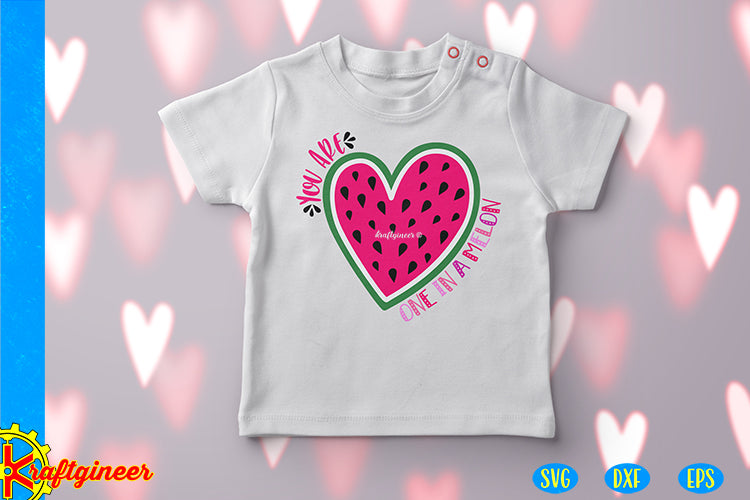 Cute Valentine's day design. A watermelon slice in the shape of a heart surrounded by the phrase "You are one in a melon" Use part or all of the design.