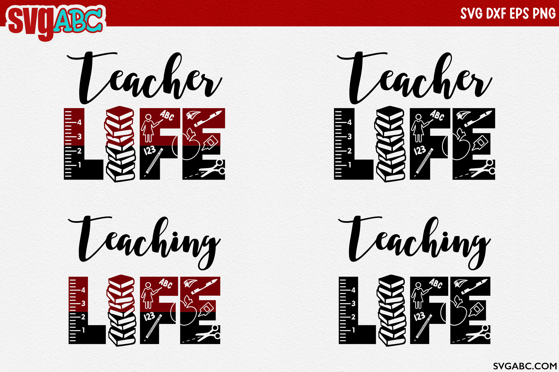 Show the teachers in your life your appreciation! Four designs included, two with the phrase “Teacher Life” and two with the phrase “Teaching Life.” The first design has the word “LIFE” is split, it has the phrase “Teacher” and the word life has cutouts of different teacher related images. The second design also has the word “Teacher” but the word life is not split and also contains cutouts of different teacher related images. The third design has the word “LIFE” is split, it has the phrase “Teaching” and the word life has cutouts of different teacher related images. The second design also has the word “Teaching” but the word life is not split and also contains cutouts of different teacher related images. These designs can be used on glass blocks, tiles, glass cutting boards, mason jars, floating frames, scrapbooking or any other craft medium. For use on many vinyl projects and even paper projects!