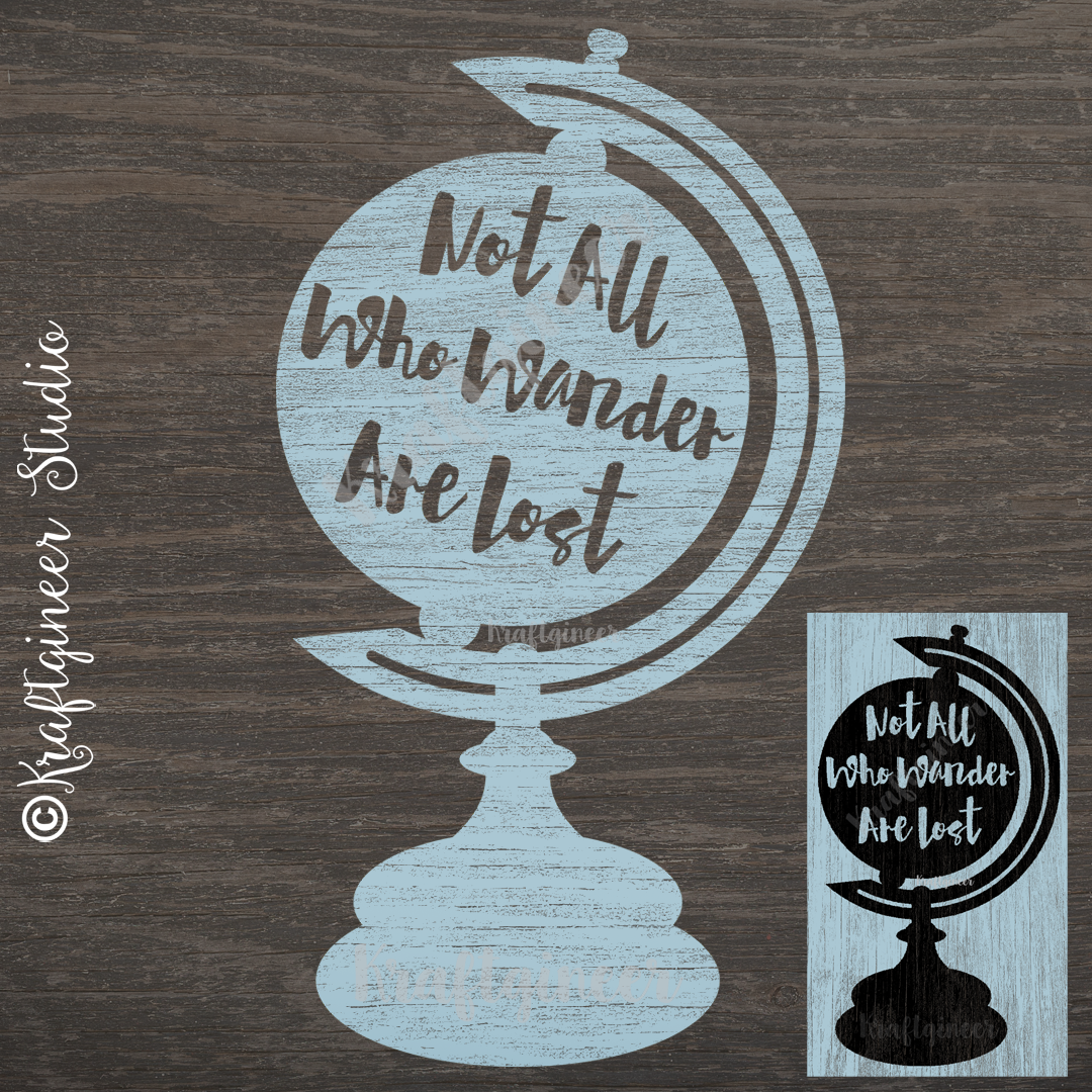 Vintage looking world globe on a stand. Inside of the globe is the phrase “Not all who wander are lost” in a beautiful script font. Two versions included, one with the text at a normal angle and one with the text tilted. This design is perfect for a vintage looking wood sign! This design can be used on T-shirts, canvas bags, garden flags, glass blocks, tiles, glass cutting boards, mason jars, floating frames, scrapbooking or any other craft medium. For use on many vinyl projects and even paper projects!