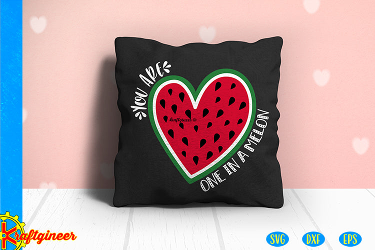 Cute Valentine's day design. A watermelon slice in the shape of a heart surrounded by the phrase "You are one in a melon" Use part or all of the design.