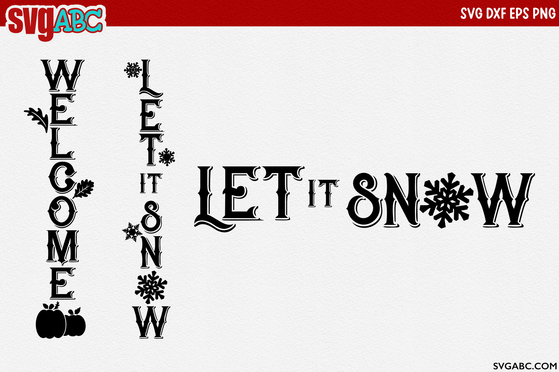 Fall and winter designs in one. Perfect for reversible vertical wooden welcome signs. One design says “Welcome and is decorated with leaves and pumpkins. The other design says “Let it Snow” and is decorated with snowflakes. The third design also says “Let it snow” but it lays horizontally. Use this design on garden flags, placemats, kid’s shirts, tote bags and other fall and Thanksgiving items! This design can be used on pillows, shirts, glass blocks, tiles, glass cutting boards, mason jars, floating frames, scrapbooking or any other craft medium. For use on many vinyl projects and even paper projects!